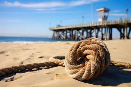 Thick, coiled maritime rope lies on the shore with a wooden pier and blue sky in the distance