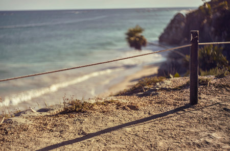 Rope fence protecting cliff edge overlooking beautiful beach in Tulum, Mexico