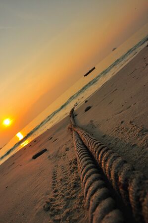 A thick rope lies on the sandy beach during a colorful sunset over the ocean.