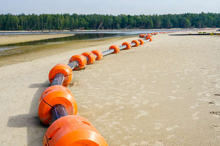 Buoys on a rope in sea water. The lifebuoys are pink restraints to alert people to the depth of the water. Rescue of the drowning. Delimiting a place on sandy beach between hotels. Wave with bubbles