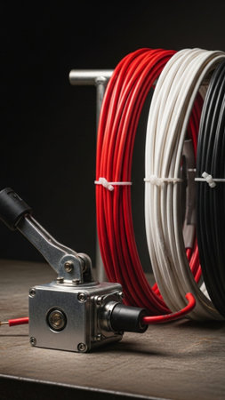 This image showcases detailed industrial cables and connectors, highlighting the intricate design and functionality within technological environments. Perfect for themes of engineering and machinery.