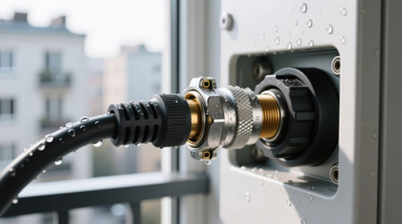 Waterproof industrial electrical cable connected to an outdoor junction box with water droplets.