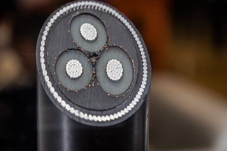 This detailed close-up showcases high-quality electrical cables featuring copper connectors, perfect for emphasizing technology and engineering themes.