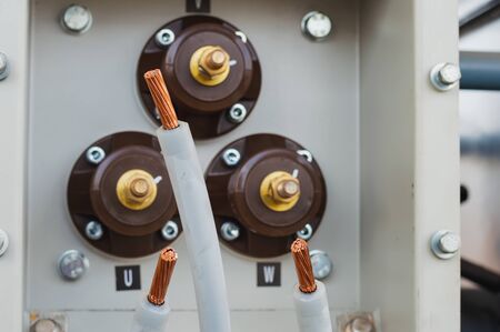 A close-up view of copper cables connecting to a power source, highlighting the intricate details of electrical wiring in an industrial environment with a blurred backdrop.