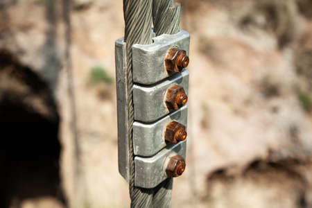 Steel twisted rope and steel bolt anchor eye in concrete base. The end knot of steel rope.