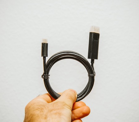 Hand holding Mini DisplayPort and DisplayPort cables with main focus to the cable connections - tilt-shift lens used
