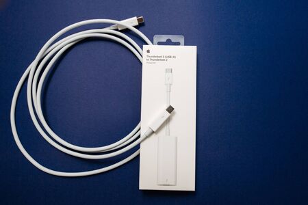 STRASBOURG, FRANCE - NOV 8, 2018: Apple Computers Thunderbolt 3 to Thunderbolt 2 adapter and thunderbolt usb-c cable on a blue background