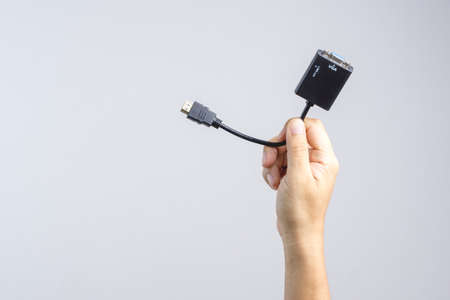 Hand holding adaptor HDMI to VGA cable connector on white background