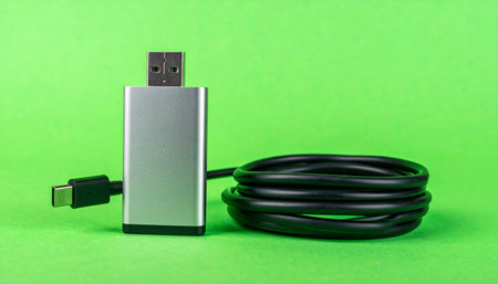 A sleek, silver USB adapter stands ready against a vibrant green background, its coiled black cable symbolizing organized and efficient connectivity.