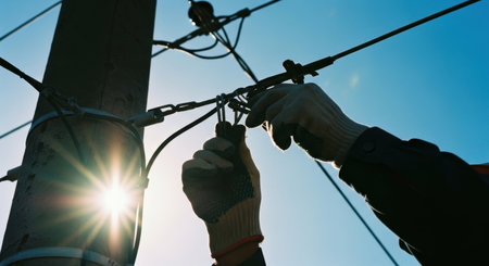 Gloved hands of an electrician or utility worker connecting wires on a power pole, silhouetted against a bright blue sky with sun flare, symbolizing hard work and essential services.