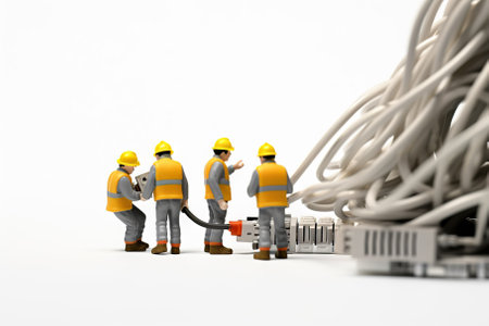 This captivating features miniature technician team figurines, skillfully handling a Cat5 network cable. Their precise actions symbolize the core principles of networking, showcasing expertise, connectivity, and teamwork in a digital age.