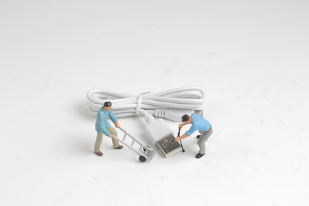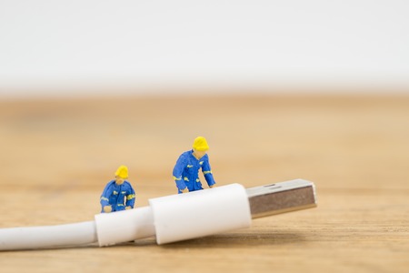 Miniature worker with USB cable, selective focus, working with technology, technology repair and service, phone accessory