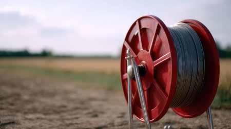 A striking red metal reel holds wire beside a vast open field under a serene blue sky. The image captures the essence of rural equipment and nature.