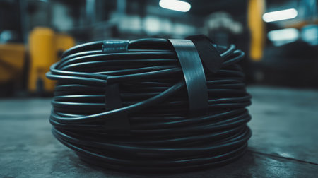 Roll of black industrial underground cable on large wooden reel at construction site. Four core al cable. Selective focus and shallow dof.