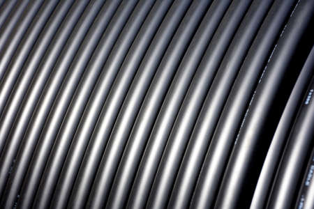 Large bobbin coil with cable wire closeup. Reel with black twisted cord