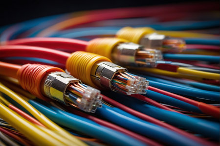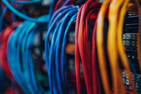 A vibrant close-up image showcasing colorful cables and connectors in a modern technology environment, highlighting intricate details and electrical connections.