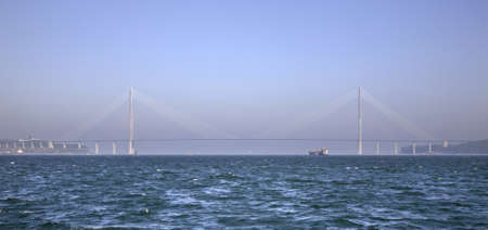Aerial view of the most beautiful Portuguese bridge in Lisbon, Vasco da Gama. Morning foggy seascape. High quality photo