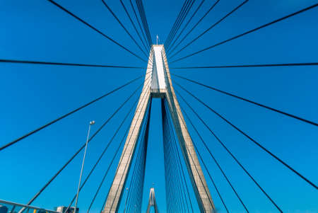 Modern bridge pylon against a blue sky. Detail of the multi-span cable-stayed bridge. Linear perspective view of a white cable-stayed suspension Alex Fraiser Bridge in BC. Nobody, selective focus
