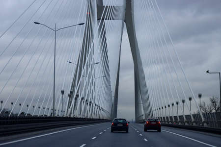 Cars going over cable bridge with tall pylons and cables, evening blue hour light. Redzinski Bridge, Wroclaw, Poland - December 24, 2021