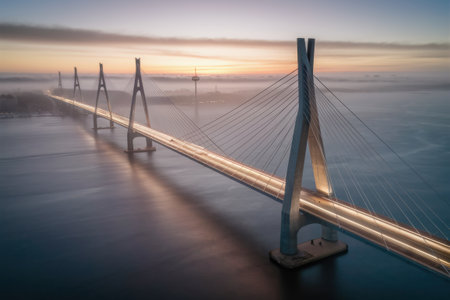A stunning view of a suspension bridge, showcasing sleek steel cables and an inviting empty roadway, surrounded by a gentle mist, perfect for evoking tranquility and exploration.