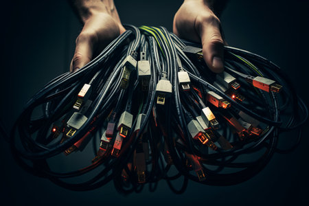 A vibrant close-up image showcasing colorful cables and connectors in a modern technology environment, highlighting intricate details and electrical connections.