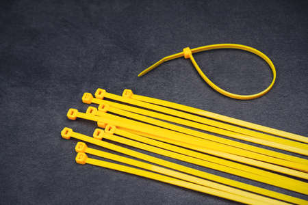 Yellow cable tie on the cement floor background
