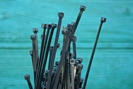 Plastic black ties on an orange background. Plastic ties for cables.