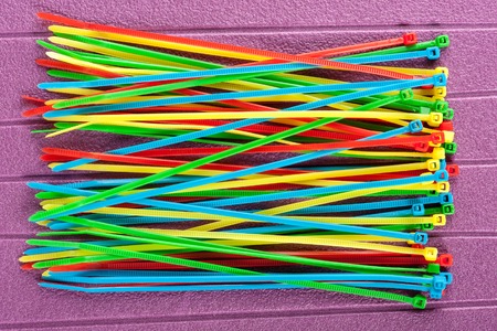 heap of colorful cable ties on purple background