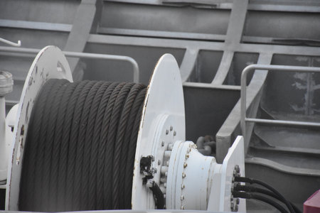 a ship with a large round metal wheel holding a long anchor rope on board a ocean going vessel