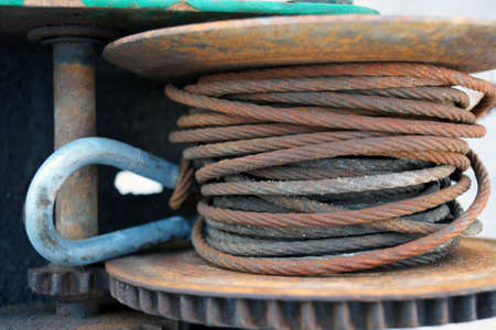 rusty wire rope sling on crane reel drum . winch roll of crane the lifting machine