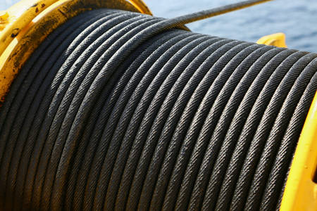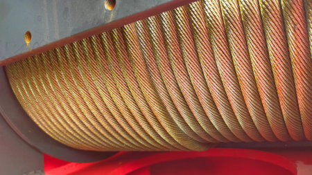 Aerial perspective of a robust winch system featuring intertwined steel cables and mechanical components, highlighting the intricate design and engineering of industrial machinery in action