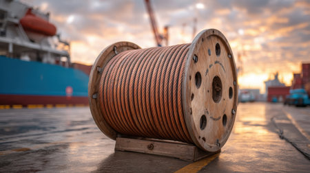 A striking image of a copper wire spool resting on a dock, framed by a vibrant sunset and the hustle of maritime activity, capturing industrial beauty and functionality.