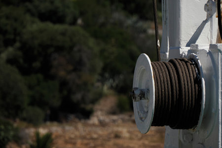 Durable iron winch on the ship for lifting and lowering boats into the water