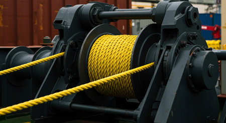 A close-up view showcases a sturdy winch with a shiny hook, surrounded by coils of strong cable. The metallic structure reflects fine craftsmanship. A backdrop of additional pulleys adds depth.