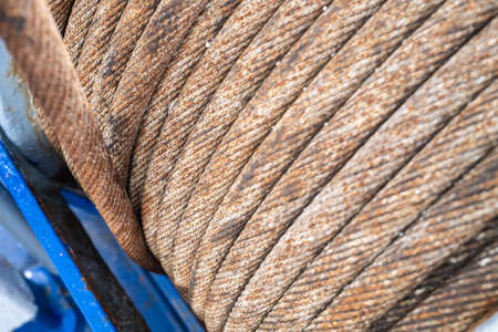 Steel cable sling hoist. Old obsolete rusty steel braided cable wounded on drum of industrial winch macro closeup texture background.