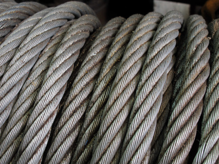 Industrial abstract background. Steel cable close-up photo. New rope lubrication.