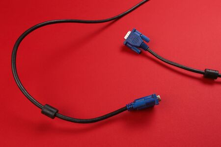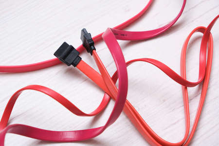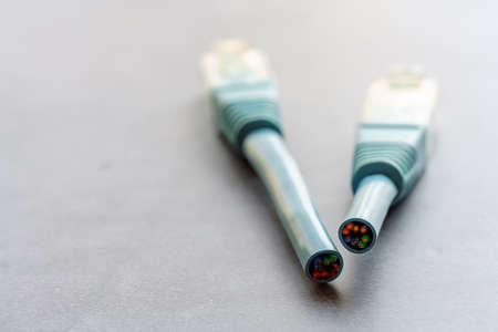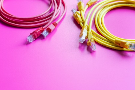 Colored cables and wires with connectors on white background. Colorful computer wires. Telecommunications. Blank for postcard with space for text. flat lay