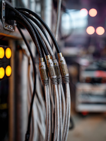 Cables and lighting hardware are arranged for a technical event setup, showing the detailed work involved in event preparation.