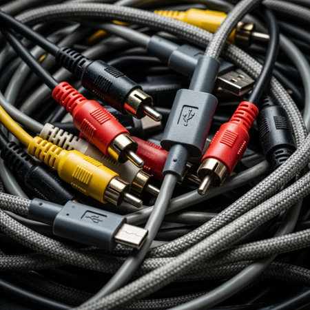Electronic components, audio-video cables, RCA plugs and USB connectors.
