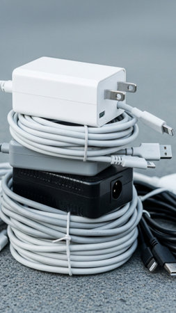Vertical Tall (9:16) composition showcasing international travel power adapters and neatly coiled ch