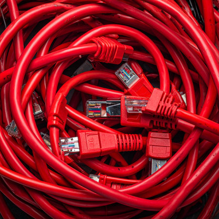 A chaotic spiral of vibrant red ethernet cables symbolizes the complex and often overwhelming nature of modern digital networks.