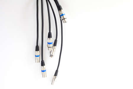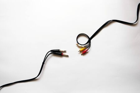 Photo on a white isolated background showing two cables for sound recording. Cord Jack 6.3 mm and RCA jack. You can use this photo as a background for projects related to audio recording, audio connection or a store with cords and cables. High quality photo