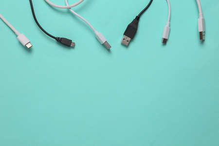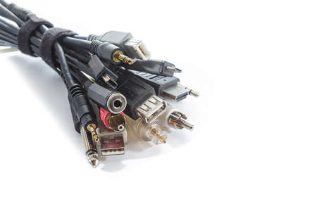 Various types of plugs and cables for audio, video, computer, smartphone and recharging connections. Evolution and change of the types of analog and USB connectors.