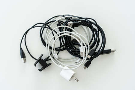 Vintage USB power cords rolled up on the white table from top angle close up. Various of Universal Serial Bus cables or USB Cable and USB charging adapter on the table.