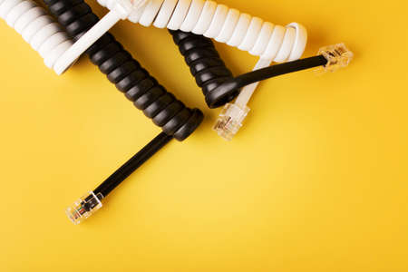 Compressed black and white spiral phone cord with connectors on yellow background. Twisted telephone cable with copyspace.