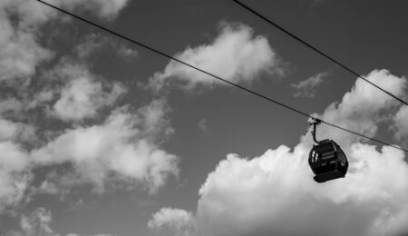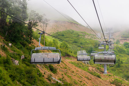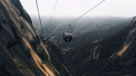 Tourists climb the mountain peaks through dense clouds in the cabins of the cable car in the vicinity of the city of Sochi. Lack of visibility around due to heavy cloud cover.