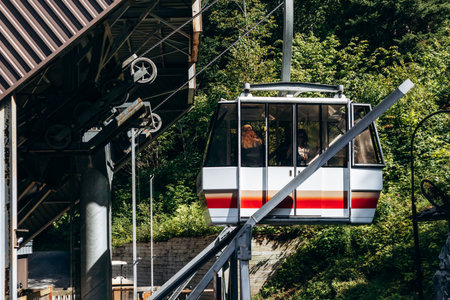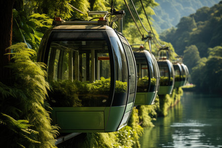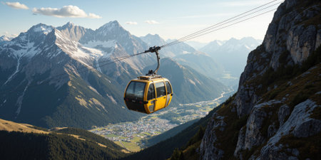 A modern cable car ascending a steep mountain, offering breathtaking views of the surrounding landscape, capturing the beauty of mountain transportation and scenic