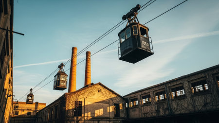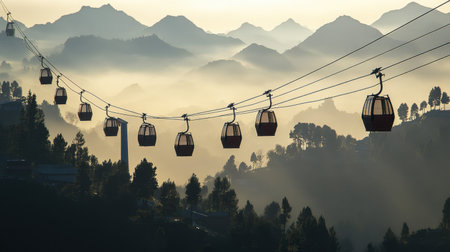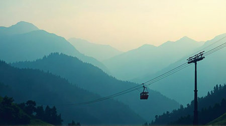 Serene cable car glides through misty blue mountain ranges at sunrise, inviting adventure.