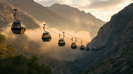Experience a breathtaking scenic journey on a cable car through a foggy valley during sunrise, surrounded by majestic mountain peaks and serene nature.
