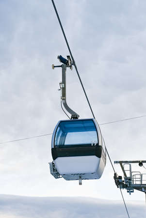 The cabin of the ski lift against the background of the blue sky and mountains in the ski resort on a sunny winter day.